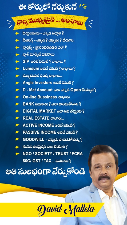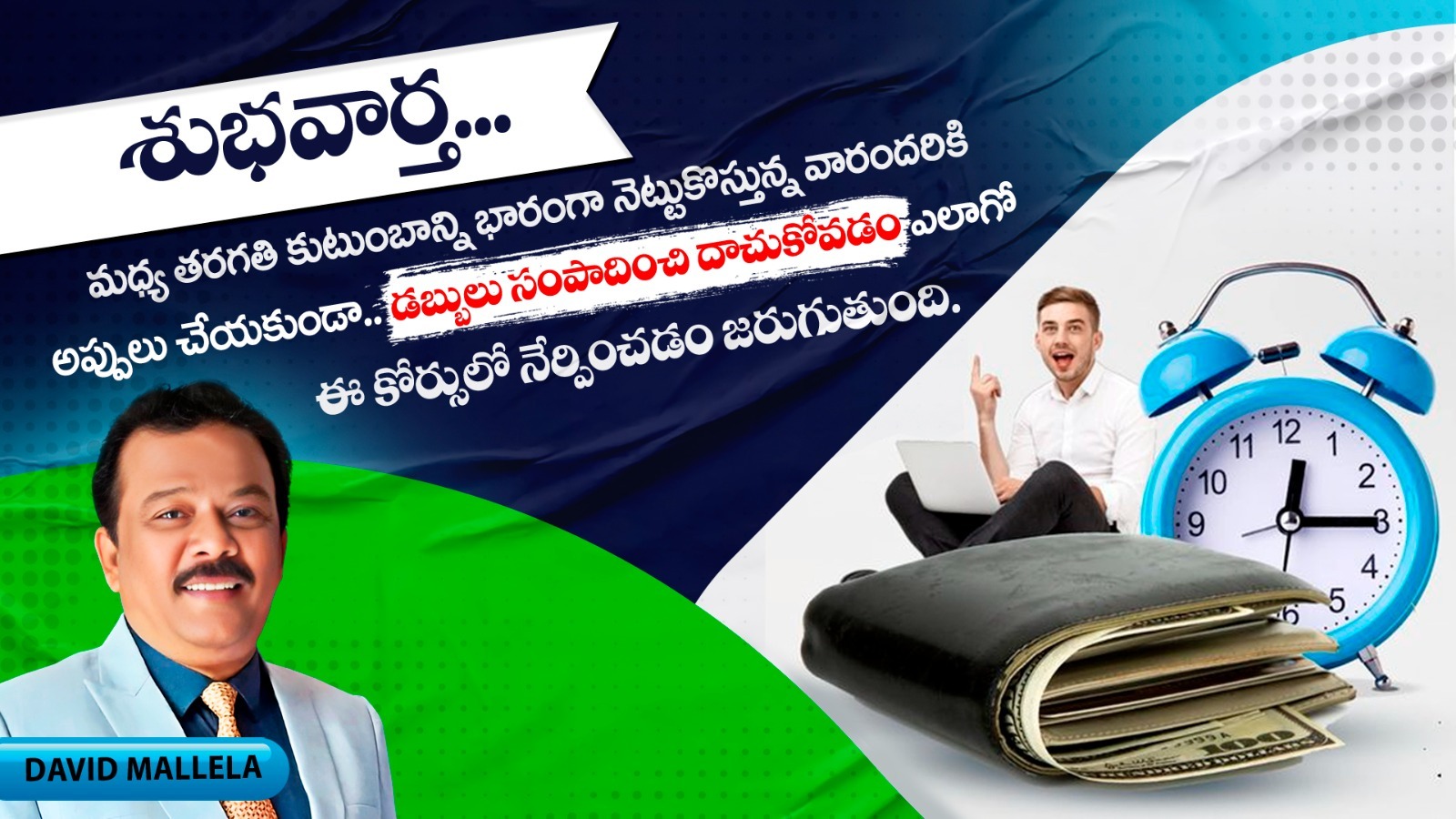 శుభవార్త..... మధ్య తరగతి కుటుంబాన్ని భారంగా నెట్టుకొస్తున్న వారందరికీ శుభవార్త..... అప్పులు చేయకుండా, డబ్బులు సంపాదించి, దాచుకోవడం, ఎలాగో?.. ఈ కోర్సులో నేర్పించడం జరిగింది నీ మొదటి లక్ష రూపాయలు అప్పు చేయకుం డా.. సంపాదించడం నేర్చుకోండి...